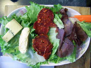 I try to stay away from the Granville Island Public Market as much as possible--it is too easy to spend every last penny buying great food. Here is a sample: cured caribou 'prosciutto' and spice wild boar salami from the great Oyama Sausage Company and runny Munster and silky Morbier from Les Amis du Fromage, Add a little green things and a large chunk of bread a wonderful lunch is made.